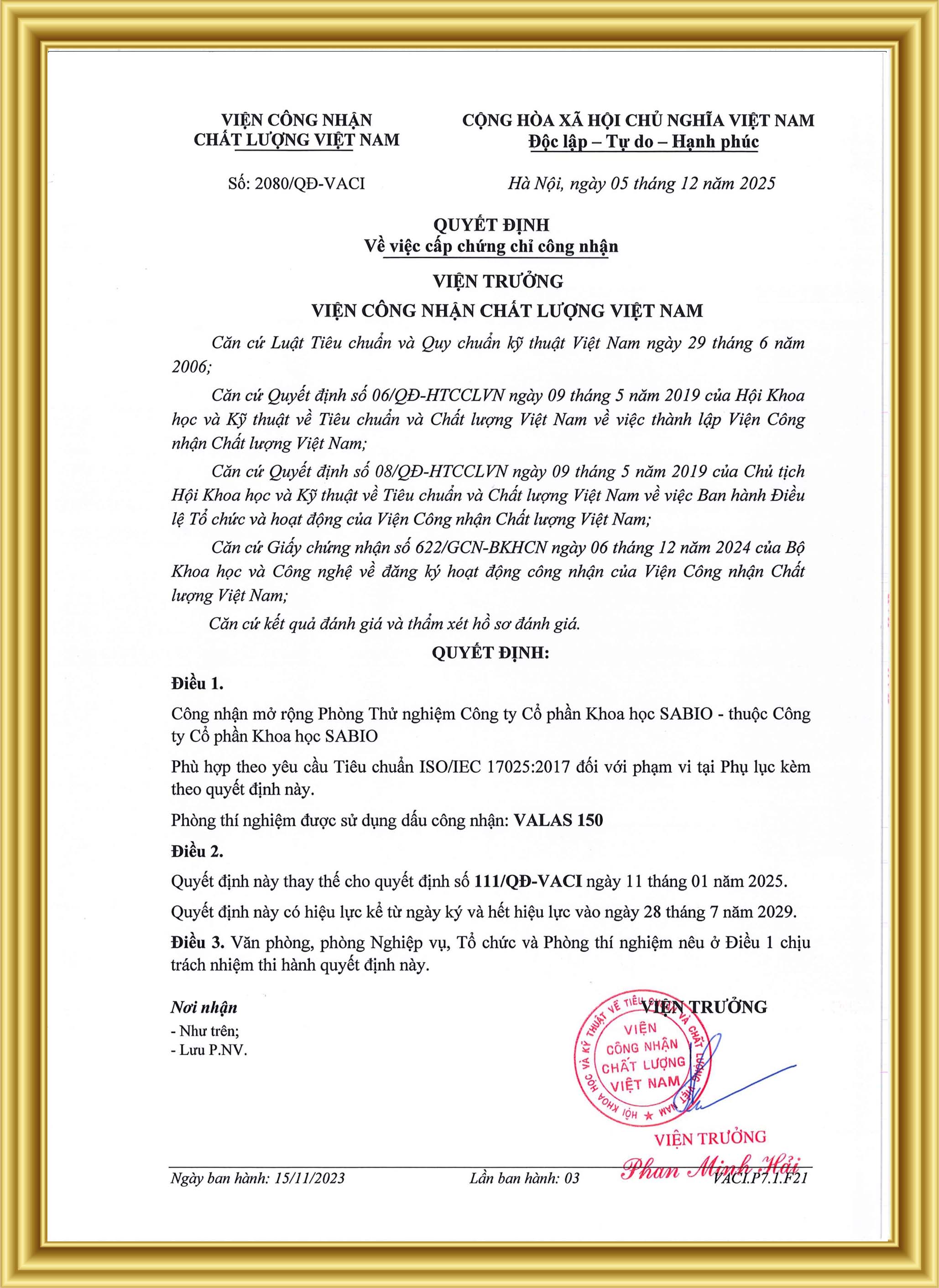Ngày 05/12/2025 Viện Công nhận Chất lượng Việt Nam đã ban hành quyết định số 2080/QĐ-VACI công nhận:
