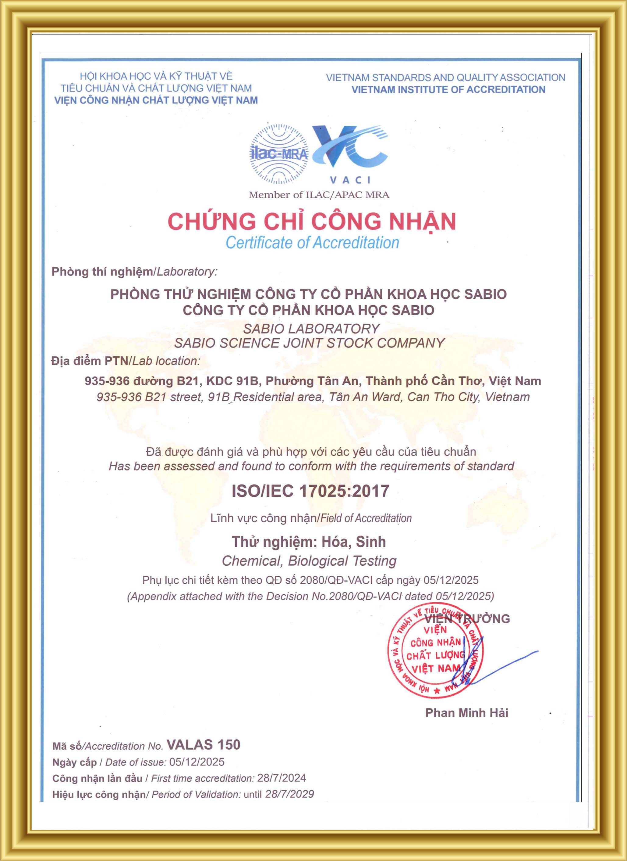 CHỨNG CHỈ CÔNG NHẬN PHÒNG THỬ NGHIỆM CÔNG TY CỔ PHẦN KHOA HỌC SABIO ĐÃ ĐƯỢC ĐÁNH GIÁ VÀ PHÙ HỢP VỚI CÁC YÊU CẦU CỦA TIÊU CHUẨN ISO/IEC 17025:2017