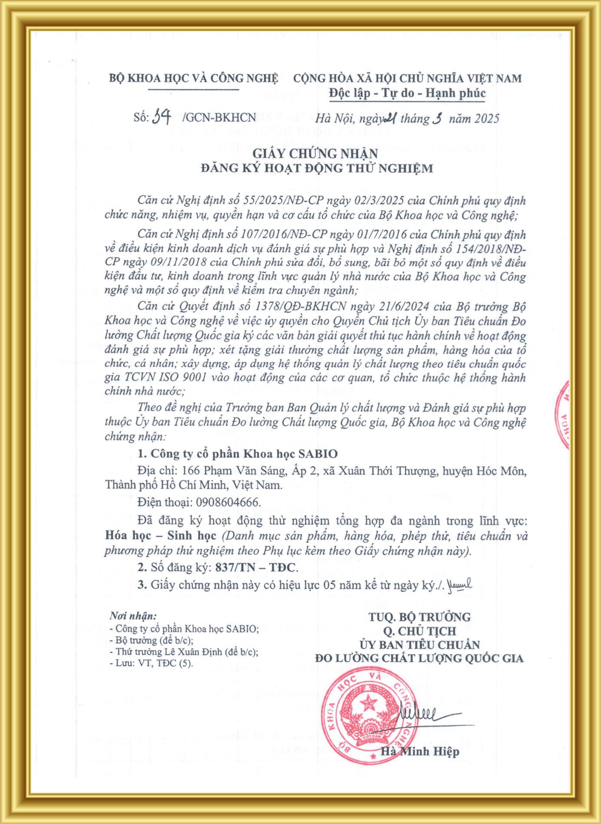 Nội dung Chứng nhận ghi rõ Công ty Cổ phần Khoa học Sabio, địa chỉ: 166 Phạm Văn Sáng, Ấp 2, xã Xuân Thới Thượng, huyện Hóc Môn, Thành phố Hồ Chí Minh đã đăng ký hoạt động thử nghiệm tổng hợp đa ngành trong lĩnh vực: Hóa học, sinh học. Mã số đăng ký của Công ty Cổ phần Khoa học Sabio: 837/TN - TĐC và Quyết định có hiệu lực 5 năm kể từ ngày ký.