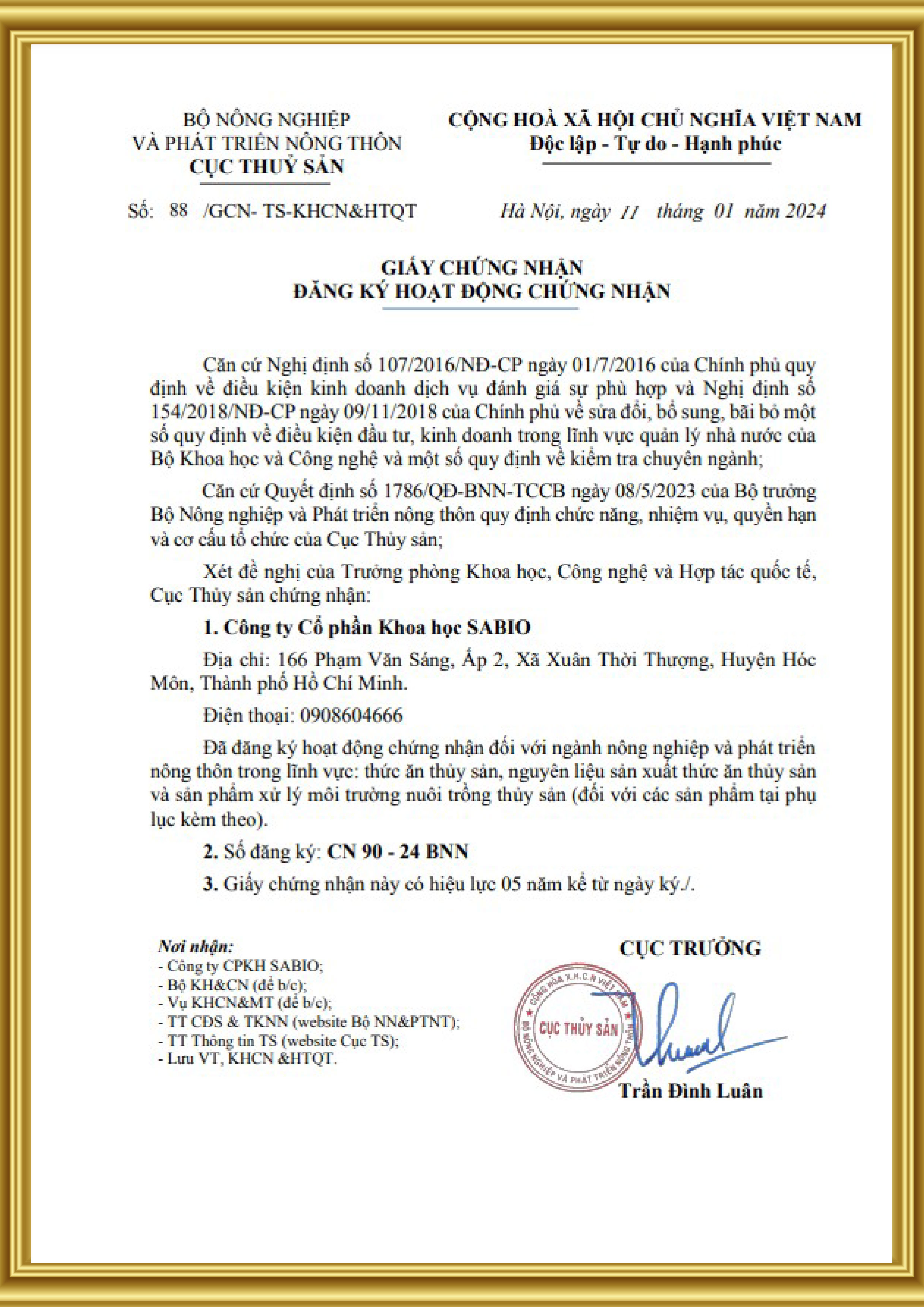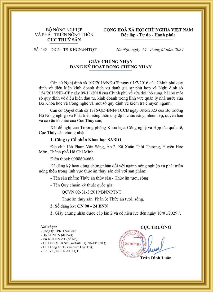 Sabio được Cục Thủy sản – Bộ Nông nghiệp và Phát triển nông thôn chỉ định hoạt động chứng nhận hợp quy thức ăn thủy sản theo Giấy chứng nhận số 88/GCN-TS-KHCN&HTQT và số 342/GCN-TS-KHCN&HTQT để đánh giá chứng nhận đầy đủ các sản phẩm thức ăn thủy sản. Bao gồm: