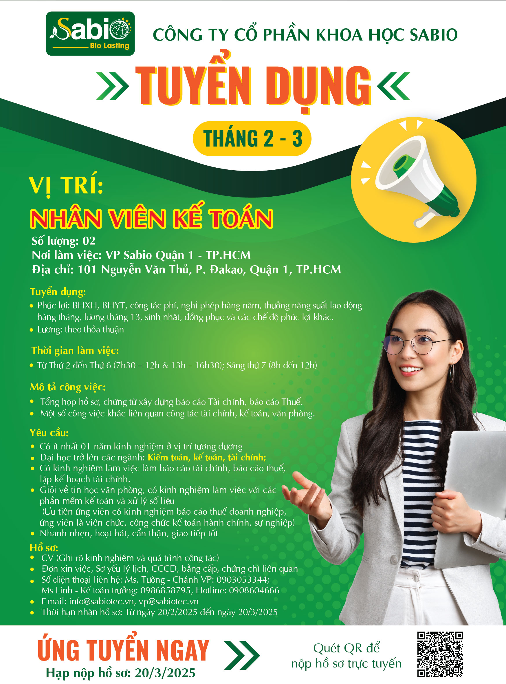 Để đáp ứng nhu cầu khách hàng ngày một tốt hơn, SABIO cần tuyển dụng vị trí công việc: